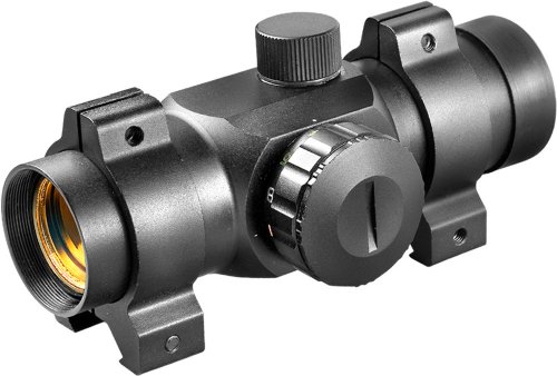 Specifications:1x, Field of View (ft@100yds/m@100m) =42/14@1x, Exit Pupil = 25mm, (30mm Tube), Click value = 1/2, Dual-Color Reticle with weaver rings, Ultra-fast target acquisition, pinpoint accuracy and wide field of view, ideal for handguns, rimfire rifles, shotguns, pistols, blackpowders and crossbows. Finger adjustable rheostat, anti-reflective coating, and integrated mount for optimum performance, unlimited eye relief and multi-coated optics.